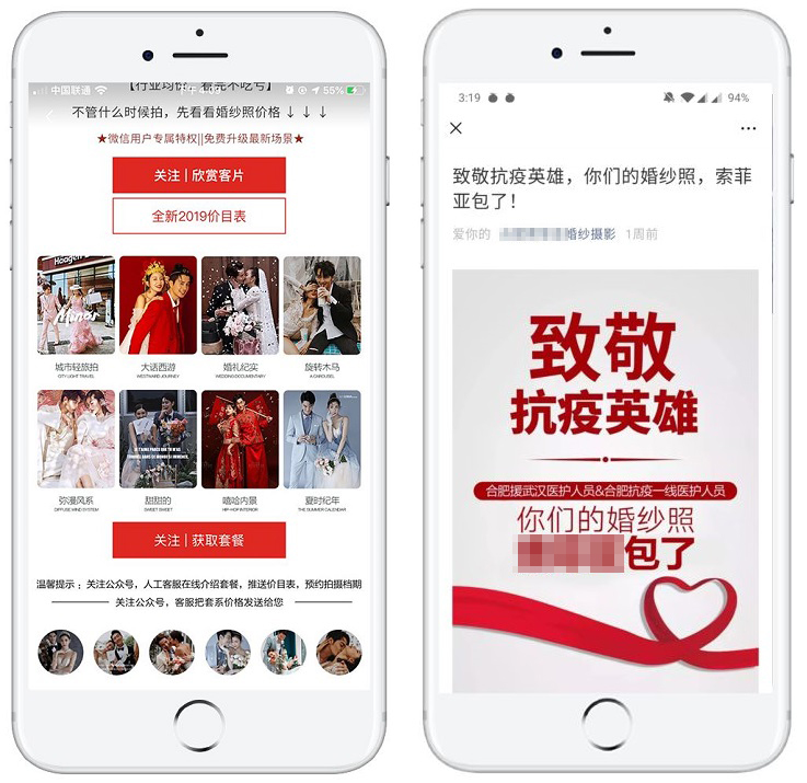 索菲亞婚紗攝影借助朋友圈廣告拉新獲客,通過公眾號關(guān)注進行流量沉淀,再用內(nèi)容種草實現(xiàn)客戶的轉(zhuǎn)化與留存。尤其是在本次疫情期間,索菲亞婚紗攝影公眾號推出“致敬抗疫英雄”的主題活動,為合肥當(dāng)?shù)氐目挂吖ぷ髡咚腿ジ@?,引起讀者的情感共鳴,促進了客戶的留存、轉(zhuǎn)化。